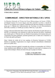 Initialement prévu pour le 6 juillet 2025, le congrès de l’Union des Forces démocratiques de Guinée (UFDG) est suspendu. Cette décision, prise à la suite d’un courrier du ministère de l’Administration du Territoire, intervient dans un climat de tensions internes.