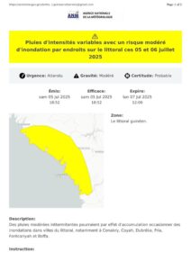 L’Agence Nationale de la Météorologie (ANM) lance une alerte pour les 5 et 6 juillet sur le littoral guinéen.