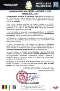 Le Ministère de la Sécurité et de la Protection Civile de la République de Guinée annonce la prolongation exceptionnelle du délai pour la correction des anomalies sur les passeports biométriques jusqu’au 31 mars 2025. Cette mesure concerne tous les citoyens guinéens, tant sur le territoire national qu’à l’étranger.