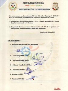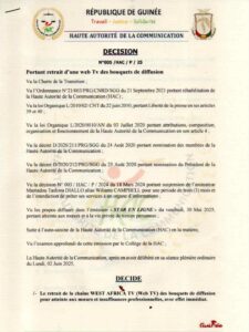 Dans un communiqué rendu public ce lundi 02 mai 2025, la Haute Autorité de la communication(HAC), décide du retrait de la chaîne WEST AFRICA TV( Web Tv) des sociétés de distribution Canal+ Guinée et STARTIMES Guinée pour atteindre aux moeurs et insuffisances professionnelles avec effet immédiat.