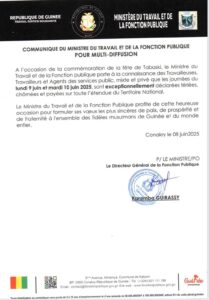 À l’occasion de la fête de la Tabaski, le gouvernement guinéen a décrété les journées du lundi 9 et du mardi 10 juin 2025 fériées, chômées et payées sur toute l’étendue du territoire national.